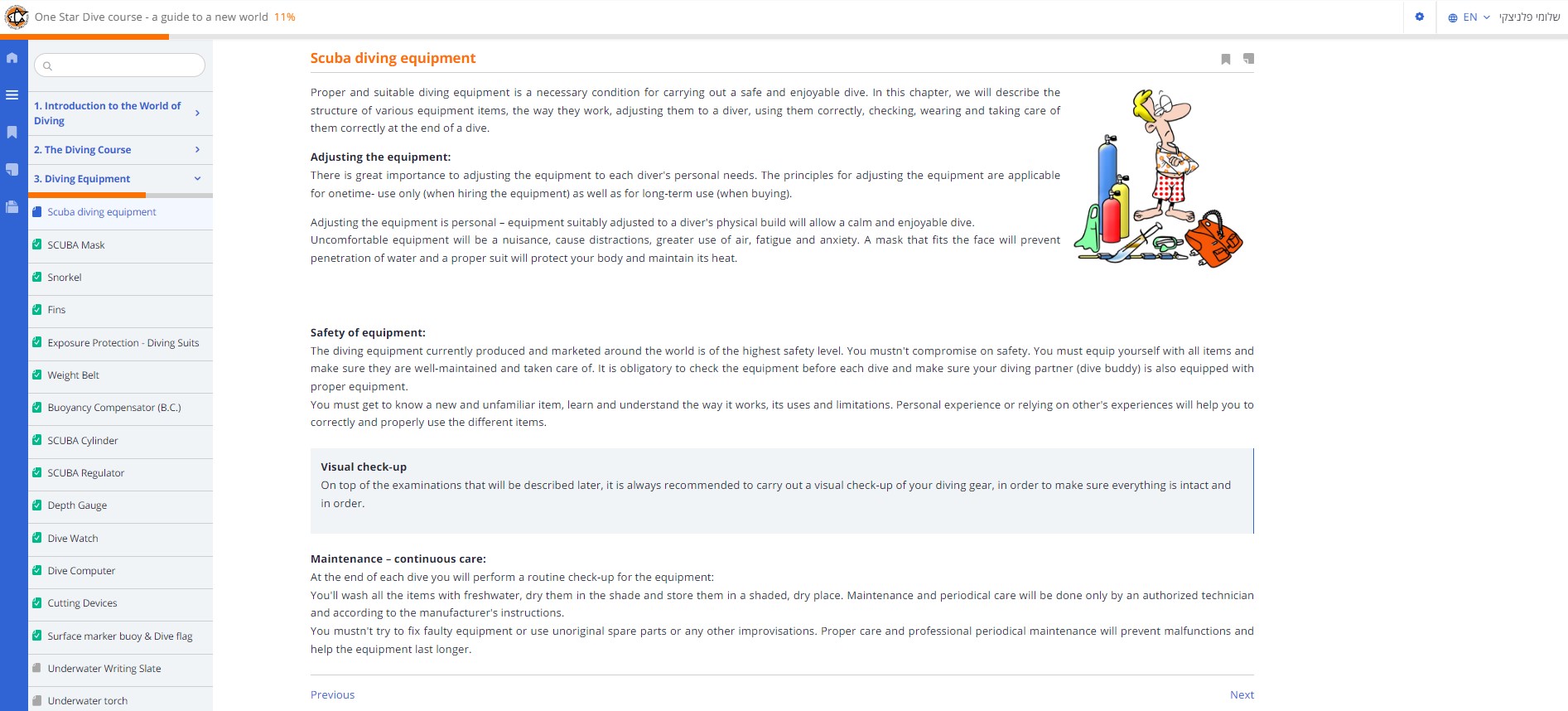 The course is organized by topics/chapters, clicking on which will open the list of study topics. Clicking on any subject will display it in the center of the screen.