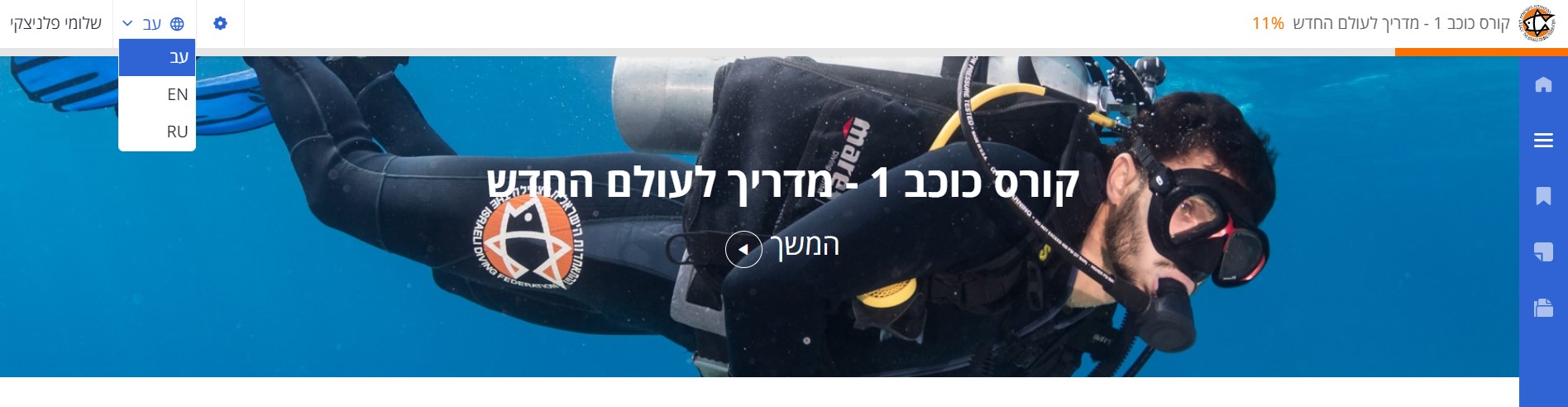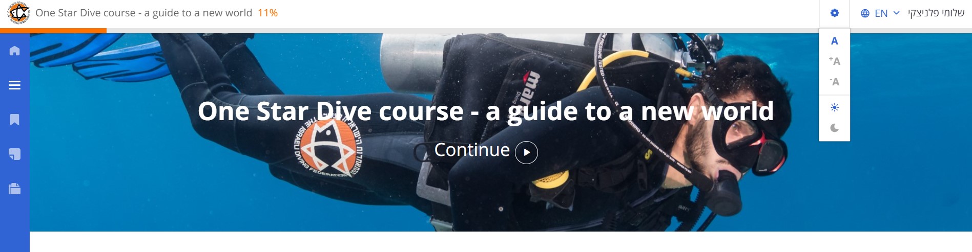 The top menu will include the name of the course and will show progress tracking in the course in percentages and with an orange progress graph.