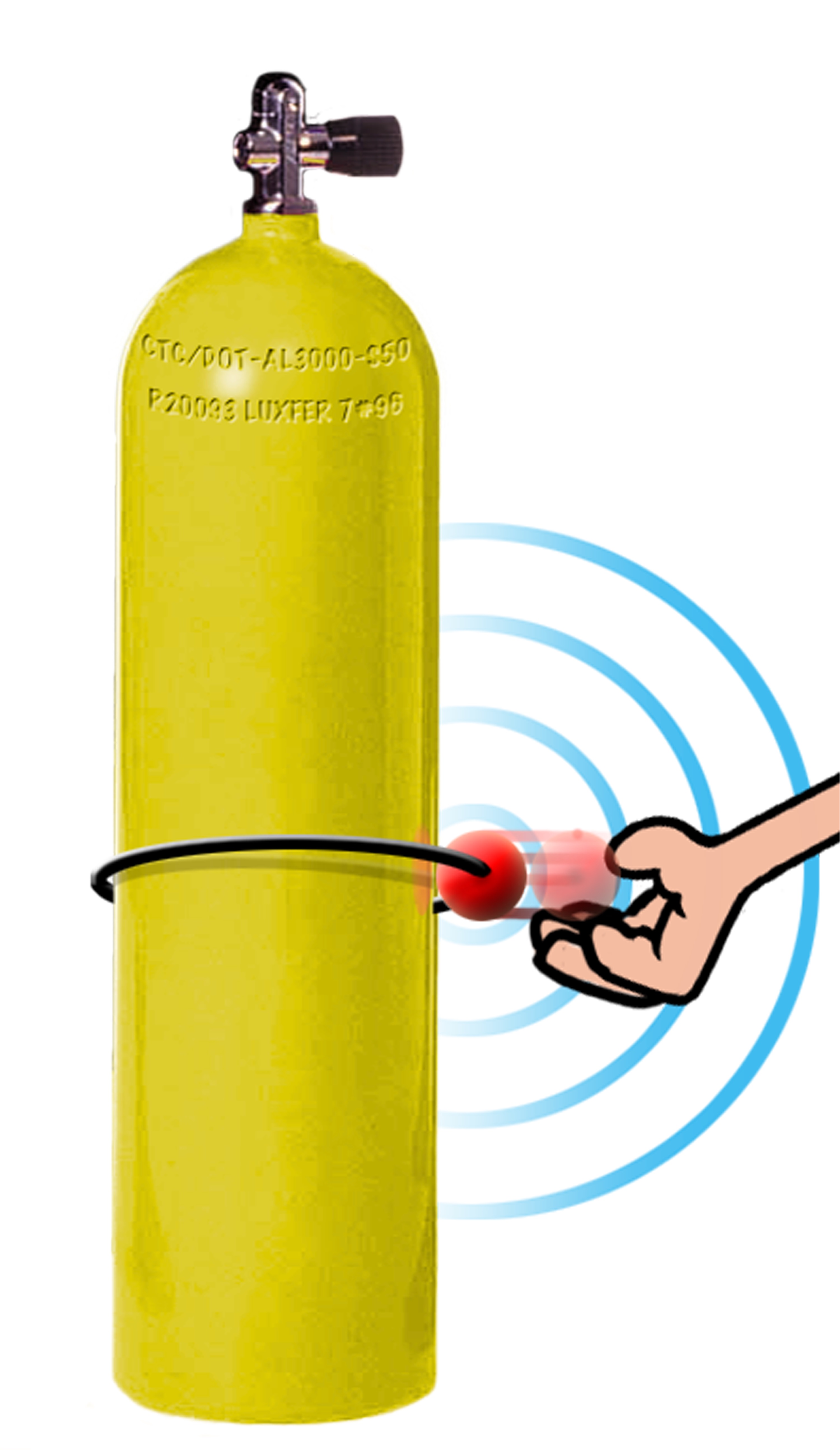 Another possibility is using a knife or stone to tap on the tank – the metal clink is well heard underwater. Enthusiastic divers equip themselves with a rubber band that has a big bead threaded on it, and can be attached to the bottom part of the tank. Pulling the bead and letting it go sounds a noticeable metal clink that will make your dive buddy give you his full attention.