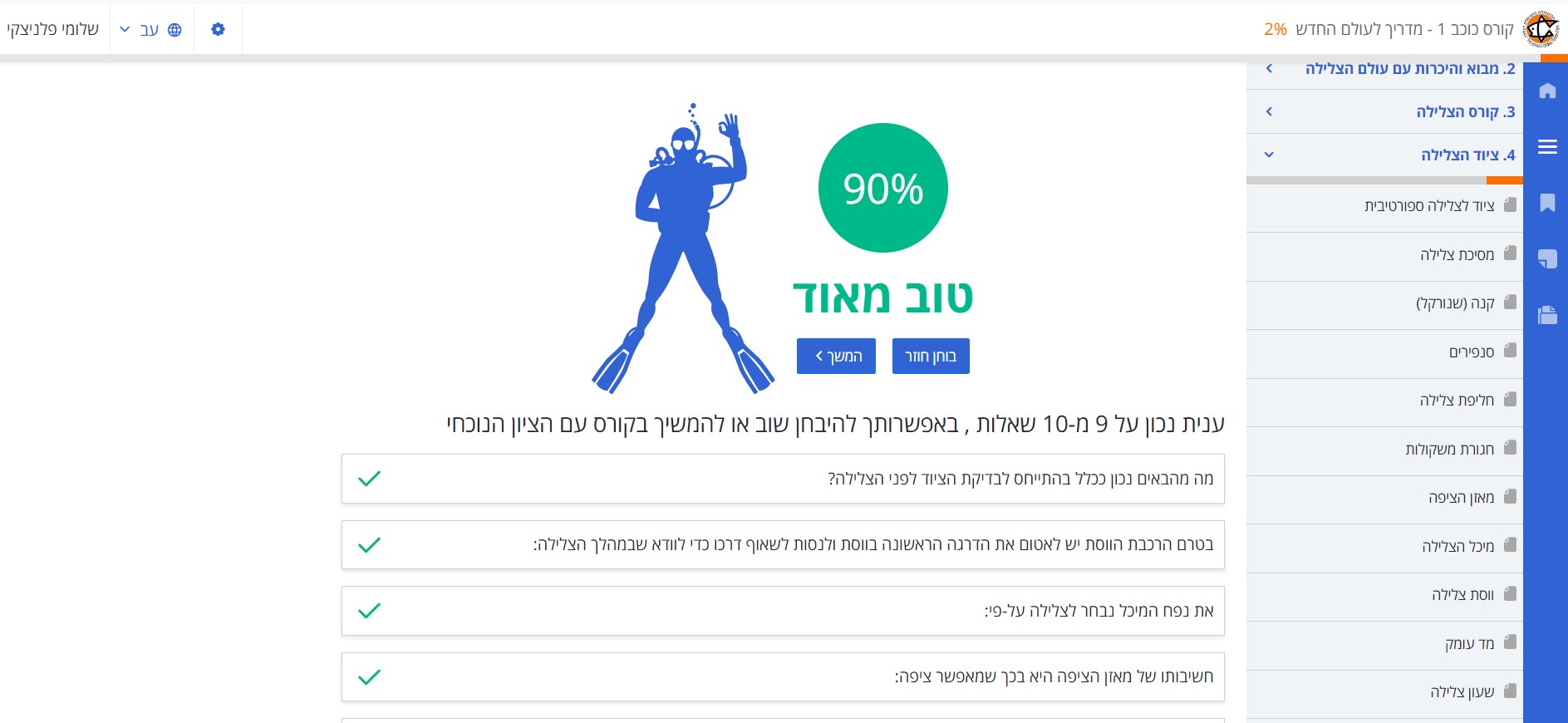 במקרים בהם קיבלתם ציון עובר שאינו 100, תוכלו לבחור לבצע מבחן חוזר לשיפור הציון, או לדלג לנושא הבא.