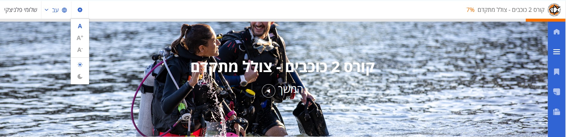 התפריט העליון יכלול את שם הקורס ויציג את מעקב ההתקדמות בקורס באחוזים וע"י גרף התקדמות בצבע כתום.