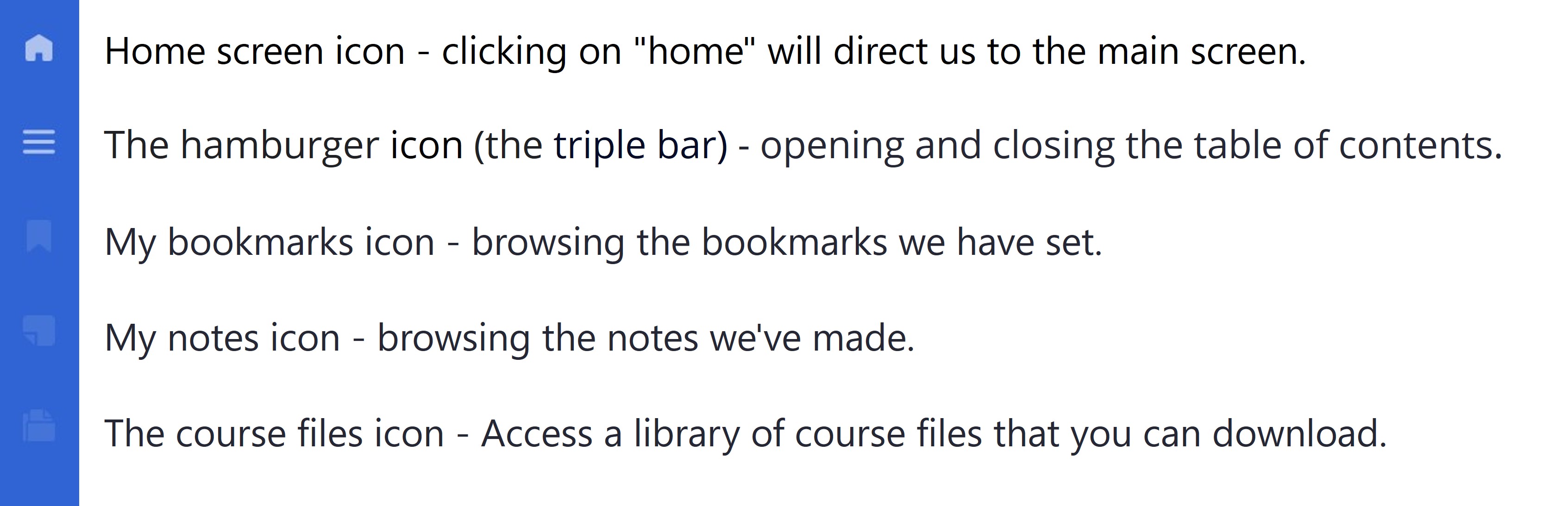 The side menu is the main menu through which we will navigate the course content and perform additional actions.